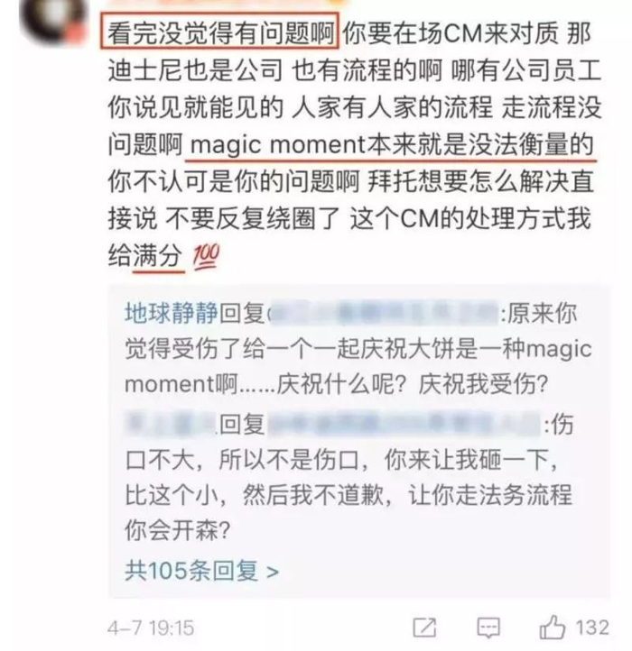 在微博接连发出三条吐槽后,“地球静静”的遭遇在网上引起了不小的争议。看完博主描述的来龙去脉和放出的视频后,有网友认为,“看完不觉得迪士尼有问题,甚至想要给满分”。反而是博主对工作人员不依不饶,“徽章难道就不是Magic Moment了吗?你到底想要什么?”