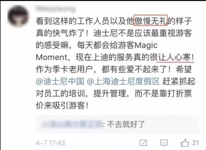 事实上,迪士尼工作人员的服务态度一直是游客吐槽的焦点。去年5月,演员黄小蕾发文控诉迪士尼工作人员态度冷漠、全程没有笑容,她提出质疑还被工作人员以包围和看热闹的方式对待。(戳链接,看小观当时的报道:女演员与上海迪士尼微博开战!究竟孰是孰非?现场视频曝光了→)