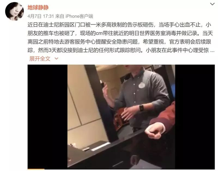 据微博用户“地球静静”透露,她在迪士尼新园区门口被一米多高铁制的告示板砸伤,当场手心出血不止。然而让这位迪士尼忠粉、三季季卡游客寒心的是,当她三天后希望迪士尼乐园给予孩子关心和慰问时,迪士尼工作人员却态度十分傲慢。