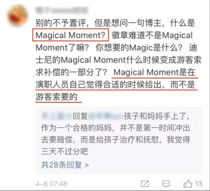 事后,该网友认为孩子在事件中心理受惊程度大于受伤程度,3天后她又来到迪士尼乐园,希望迪士尼给小朋友一个非物质的magic moment作为安慰。
