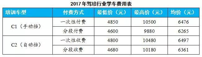 根据驾培企业备案数据,2017年全市学车价格区间为4600~10500元,平均价格为6400元。其中C1类均价为6371元(一次性付费6476元,分段付费6265元),C2类均价为6429元(一次性付费6497元,分段付费6361元)。