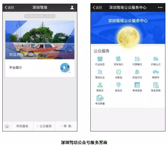 市民学车前,可关注“深圳驾培”微信公众号或支付宝生活号。此平台为公众提供驾驶培训学驾注册、学员培训过程信息查询、深圳市驾培行业信息(如班别费用、付费模式、企业基本信息、合同范本、训练场、考场信息、考试合格率信息等)。