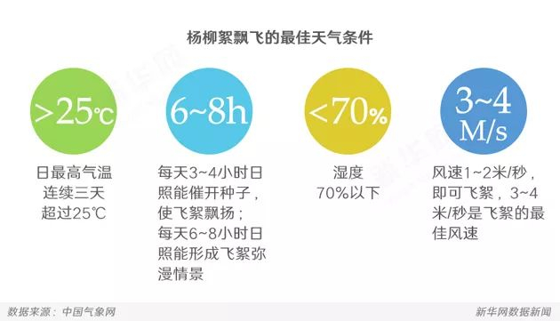 根据多年的物候观测,当春天白天最高气温连续三天超过25℃,相对湿度在70%以下,天气晴朗且有一定的风时,最有利于飞絮飘扬。