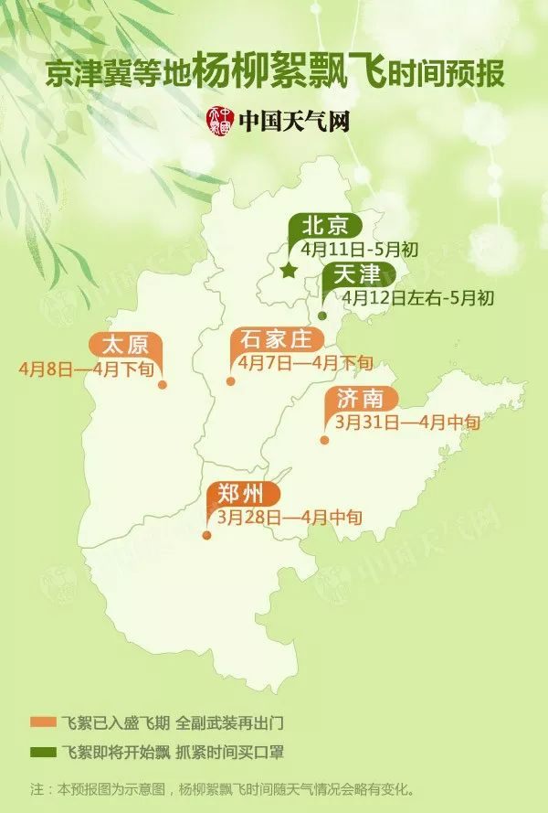 由于济南、郑州、石家庄等地纬度偏南,气温更高,所以飞絮日子比北京早。石家庄的飞絮在4月9日进入盛飞期,济南、郑州等地清明节前后也开始飞絮。