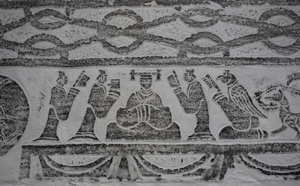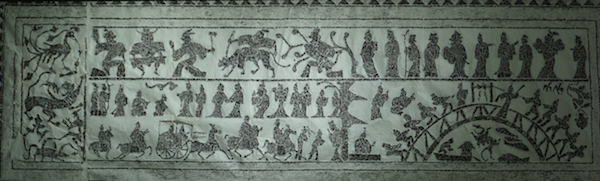 徐州出土的汉画像石(局部),左边阙中端坐着西王母,被人首蛇身、马面人身、鸟头人身、人头人身四位仙人拜见