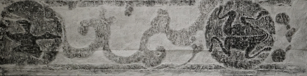 还值得注意的是频繁出现的蟾蜍,除了和捣药玉兔搭配,蟾蜍也和阳乌搭配,一种说法是二者分别代表月亮和太阳,即代表阴与阳。
