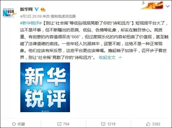 今年4月3日,新华网点名批评了“社会摇”,认为“社会摇”等低俗视频晃散了年轻人的“诗和远方”,让他们沉溺其中,欲罢不能。