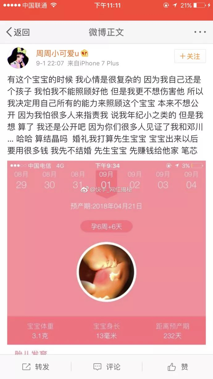 当时17岁的网红周周小可爱宣布怀孕 图片来源@快手_网红揭秘