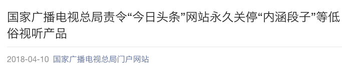 4月10日消息,国家广播电视总局责令“今日头条”永久关停“内涵段子”客户端软件及公众号,并要求该公司举一反三,全面清理类似视听节目产品。