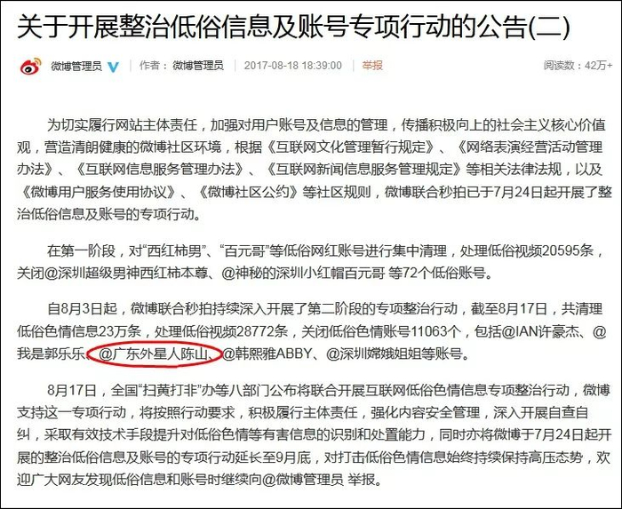 去年8月,新浪微博以低俗色情为由关闭了陈山的微博账号@广东外星人陈山。