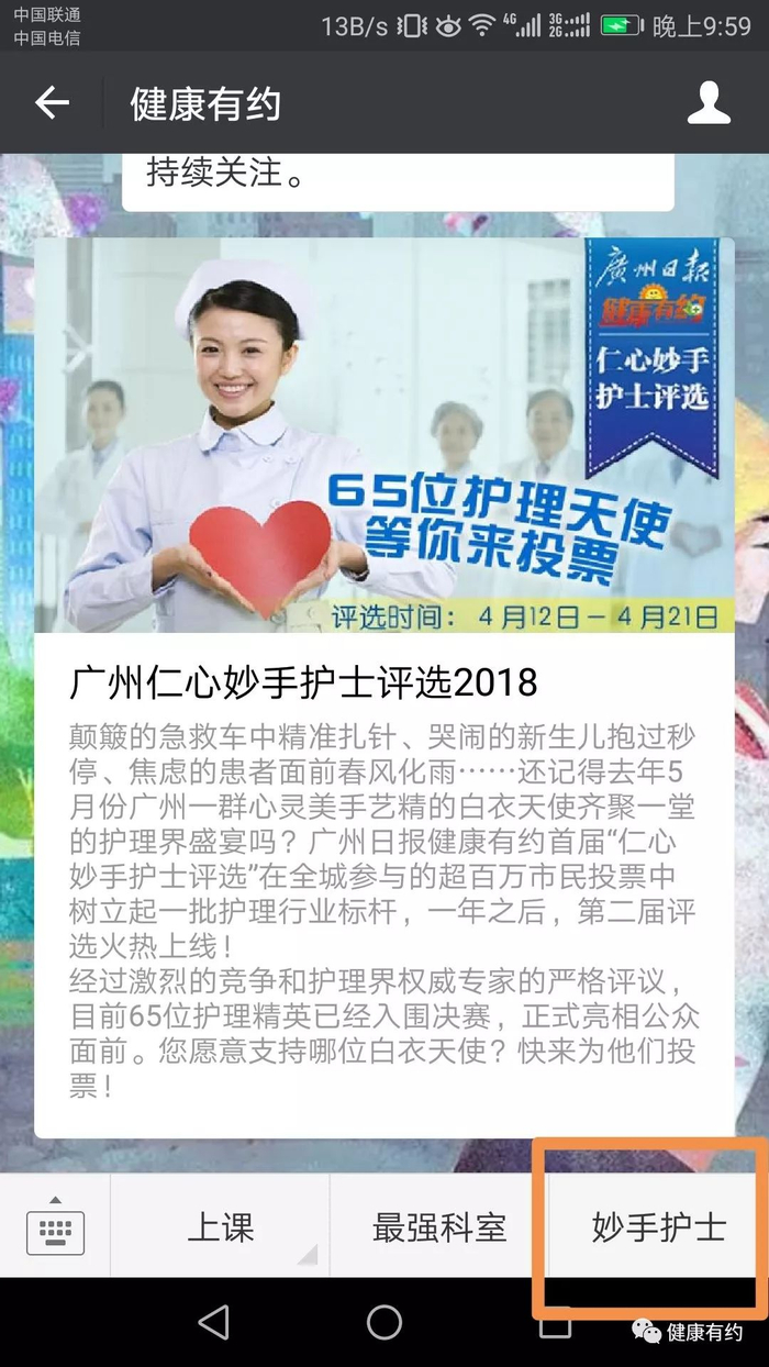 点击公众号“健康有约”页面下拉菜单右侧的“妙手护士”,进入弹出投票页面,点开照片页面,下拉到最后投票。