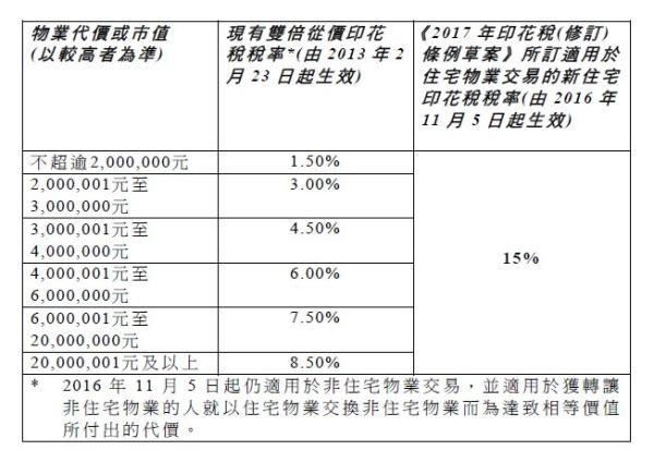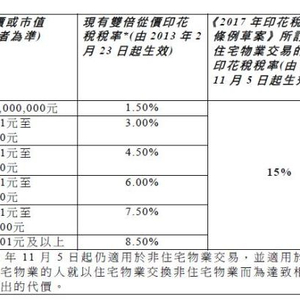 香港政府在2016年11月4日公布新住宅印花税措施,即就住宅物业交易须予征收的印花税的税率从1.5%至最高8.5%增加到统一的15%,目的是协助减少投资需求和冷却住宅物业市场,但居民的第一份买卖合同享有豁免权,仍按照原税率执行。新住宅印花税措施在2016年11月5日生效,当时并没有限制以一份文书可取得的住宅物业数目。