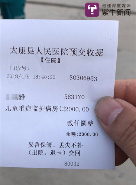 “到了太康县人民医院后,孩子母亲陪同雅雅进了重症监护室,孩子爷爷和我们两个在外面等待。”小辉说,大树基金在得知情况危急后,紧急拨付了5000元救助款,“交给医院2000元,是孩子家人先交的,我们又把钱给他们。”