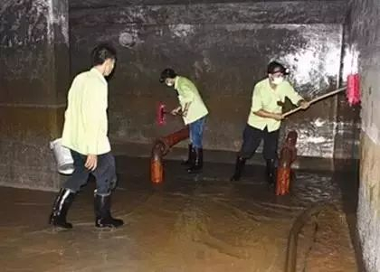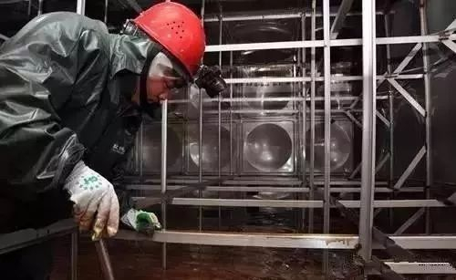 专业人员在清洗二次供水蓄水箱,锈水横流