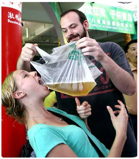 青岛特有的袋装青岛啤酒,不同于瓶装啤酒,袋装啤酒是鲜啤酒,味道不同,包装是大的密封桶往里打气通过压力出来,现买现打。