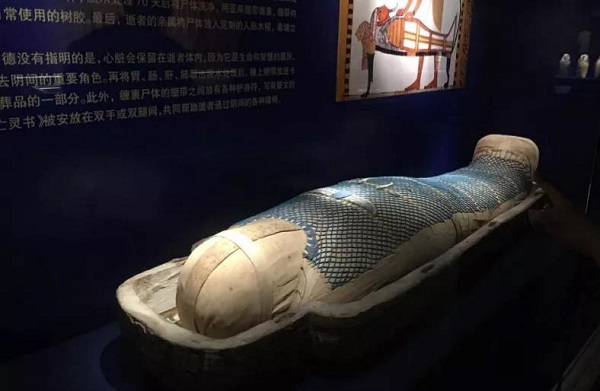 此次展览中,就有一件距今3000多年的Padiamenemope木乃伊。这件木乃伊保存完好。整个身体用绷带小心缠绕,并使用了一些重要的魔法元素进行保护,包括一件网罩——一个真正的魔法盔甲,它由一些管状的釉陶组成,把逝者的身体完好地遮盖住,为的是保护好他不被魔鬼或者一些邪恶的灵魂所侵犯。另外,由于网罩上放着一只长有翅膀的巨大圣甲虫以及陶制的荷鲁斯四子,它的能量得以进一步增强。