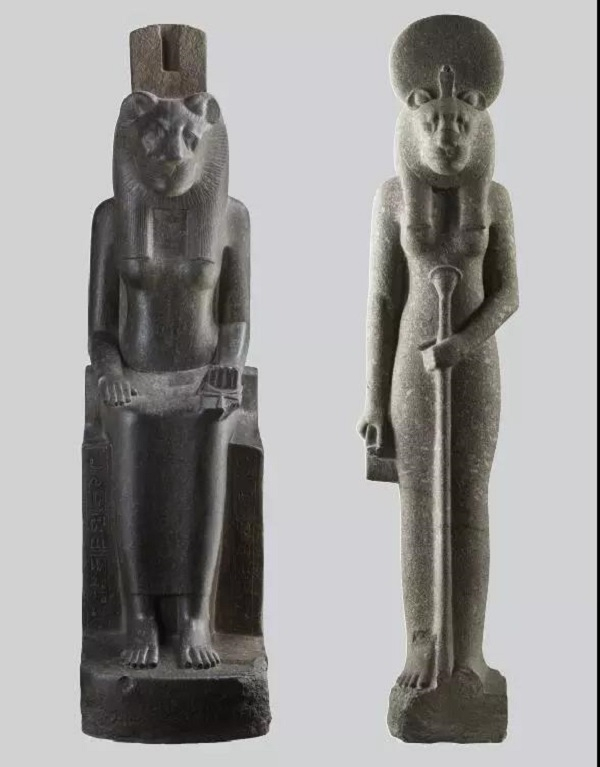 右边这尊人身狮头女神像代表同样的神祇。神像的右臂垂直置于身体一侧,左臂则弯曲于前腹,手中紧握形似纸莎草的权杖。身着紧身长衣,带有圣蛇标志的日轮位于三分式发套之上。