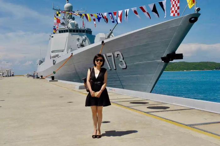 2015年长沙晚报记者舒薇与“长沙舰”合影。