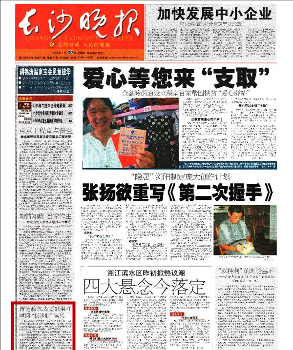 2003年7月20日,《长沙晚报》A1版刊发了市党政代表团赴湛江慰问“长沙舰”官兵的报道。