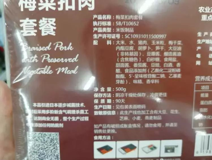 更长的还有保质期90天的梅菜扣肉套餐和鱼香肉丝套餐,它们的保存方法不用0-10℃的冷藏条件,包装上写道:“本品引进日本逐步减菌技术,密封后采用多阶新含气调理杀菌工艺,达到商业无菌,整个生产过程中未添加任何防腐剂。”