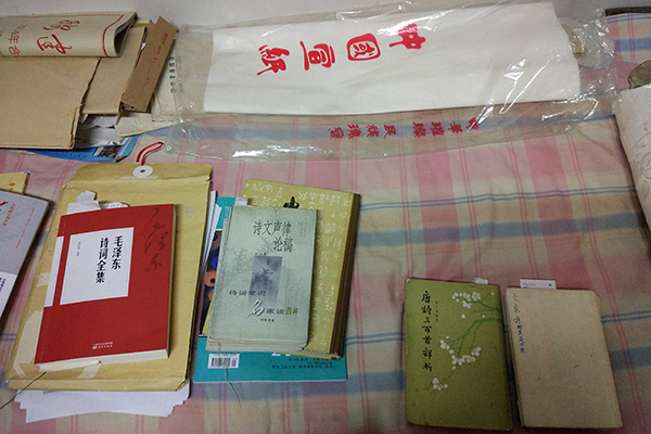 家里的床上摆满诗词相关的书籍。澎湃新闻记者 章文立 图