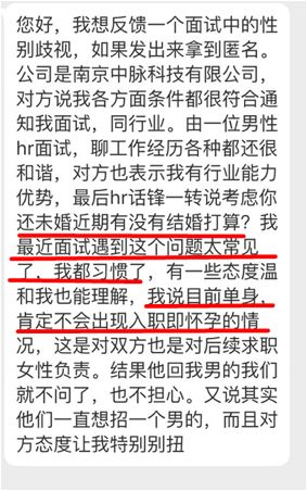 “最后HR话锋一转,‘考虑你还未婚,近期有没有结婚的打算?’,我最近面试遇到这个问题太常见了,我都习惯了;我说目前单身,肯定不会出现入职即怀孕的情况...”