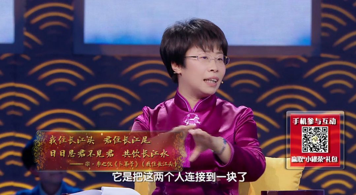 蒙曼:这首词单拆开哪一句都不好。我住长江头有什么意思?君住长江尾又有什么意思?可是把它放在一起就是:日日思君不见君,共饮长江水。在长江回环往复之中,这首词的韵味就出来了。