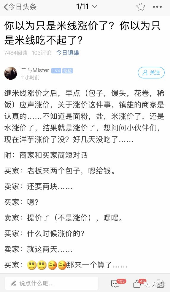 我是一名在校大学生,今天打开微信,看到镇雄米线包子涨价的新闻,不禁令我瞠目结舌。包子三元一个,米线十七块钱一碗,这让镇雄人民怎么消费得起?包子、米线这种刚需的日常消费品最能真切地体现一个地方的市场环境,物价飞涨,价格畸高,这不能说是正常的市场经济行为。