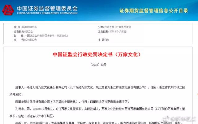 今日,证监会公布对万家文化的行政处罚决定书和相关人员市场禁入决定书,驳回赵薇夫妇、龙薇传媒、万家文化及相关当事人的申辩,最终决定: