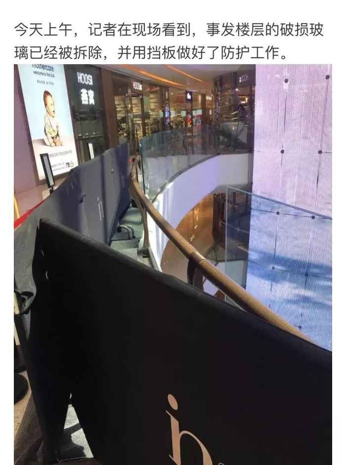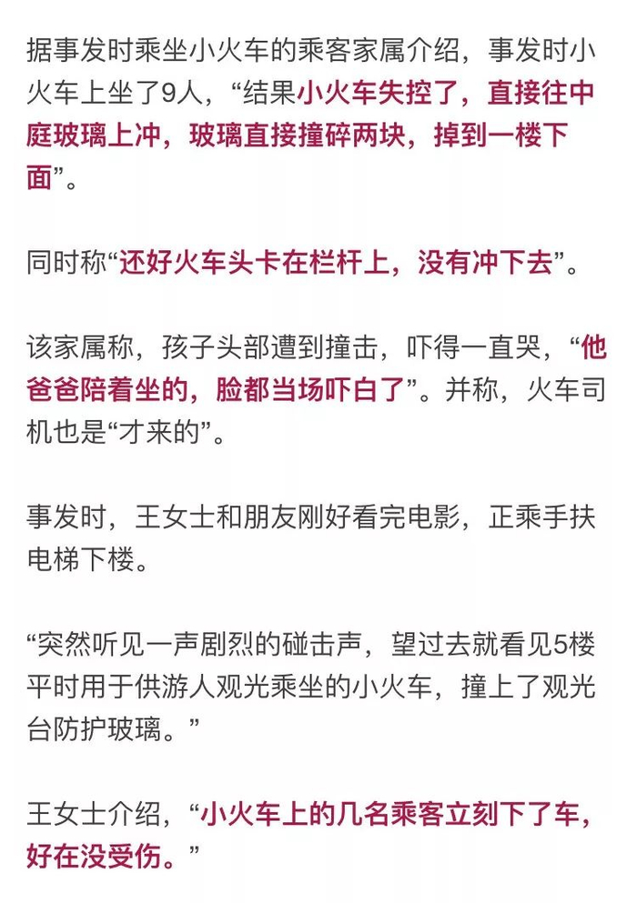 记者从现场监控画面看到,事发时小火车一旁确有三到四名其他逛商场的市民,小火车在行经事发地时拐了一个小幅度的弯,在回方向盘时,车头撞上了玻璃,车头并未卡在护栏上。