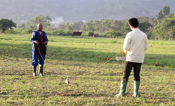 探雷鼠沿着两名训练师之间的牵引绳来回走动,利用嗅觉“扫描”炸药气味,定