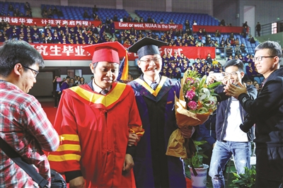 扬子晚报讯 (通讯员 于园芳 华文婷 记者 杨甜子) 昨天,南京航空航天大学举行了2018届研究生毕业典礼暨学位授予仪式,2065名研究生毕业生与母校不舍告别。这场毕业典礼因为一次特别的“红毯秀”而格外星光熠熠。20名来自南航各学院的毕业之星接受了毕业生的最高荣耀:他们在全场师生的注目下,身着学位服,与相伴了三年的导师肩并肩走上红毯,在主席台前向导师献上鲜花并深深鞠躬,成为了最耀眼的“明星”。