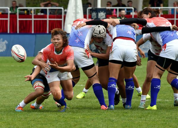 在香港扫杆埔球场举行的世界女子七人橄榄球系列赛中,中国队球员刘潇倩(前左)在比赛中传球。卢炳辉摄