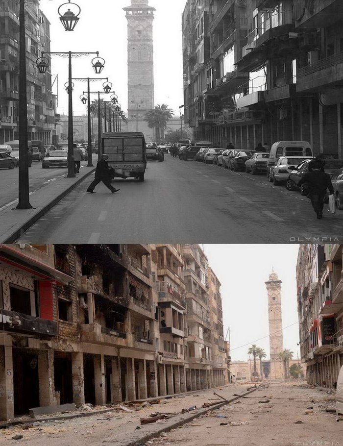 阿勒颇曾经是叙利亚最大的城市,自2012年以来阿勒颇倍受战争摧毁,它一直是叙利亚受灾最严重的城市之一。虽然随着叙利亚政府军不断解放失地,阿勒颇等地区开始恢复生机,民众开始在困境中等待着重生,但这一组摄于2016年的阿勒颇的战争前后对比照片却依然触目惊心,回顾往昔只愿世界和平,再无战争!