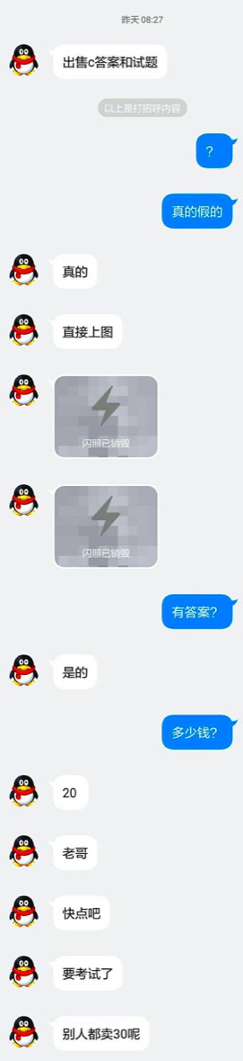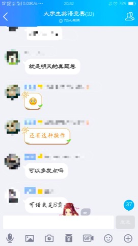 16日下午,参加此次竞赛的西安电子科技大学杨姓学生告诉澎湃新闻,考前他通过扫描买来的参考书上的二维码加入了一个名为“大学生英语竞赛”的QQ群,考试当日吃早饭时,群里有人突然“私戳”他。该学生回忆称,“他(指涉嫌泄题者)给我看了部分题的照片,(我)最初想法是这肯定是个骗子。(考完发现)我看到的部分是完全一样的。图片是用相机对着纸质卷子拍的,不是电子版。”
