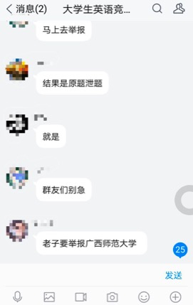 4月15日,有网友在社交媒体平台上发截图反映,在当日上午举行2018年全国大学生英语竞赛初赛之前,网络聊天群中出现了涉嫌泄题的对话。