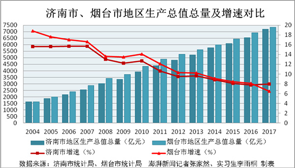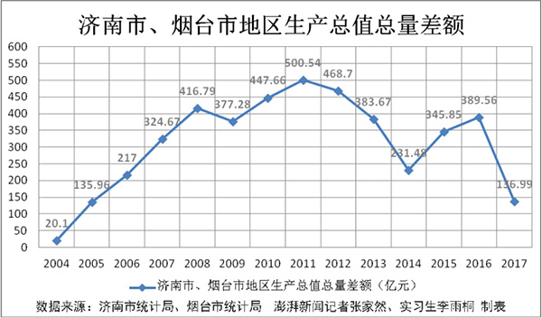 澎湃新闻对比发现,2017年,烟台GDP比济南多136.99亿元,这一差距是自2006年以来的最小值。