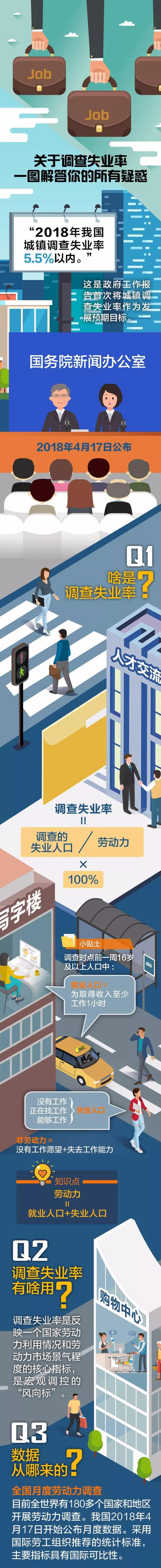 今年的政府工作报告首次将城镇调查失业率作为发展预期目标,提出“2018年我国城镇调查失业率5.5%以内”。4月17日,国家统计局首次正式发布中国城镇调查失业率,1至3月份,分别为5.0%、5.0%和5.1%。