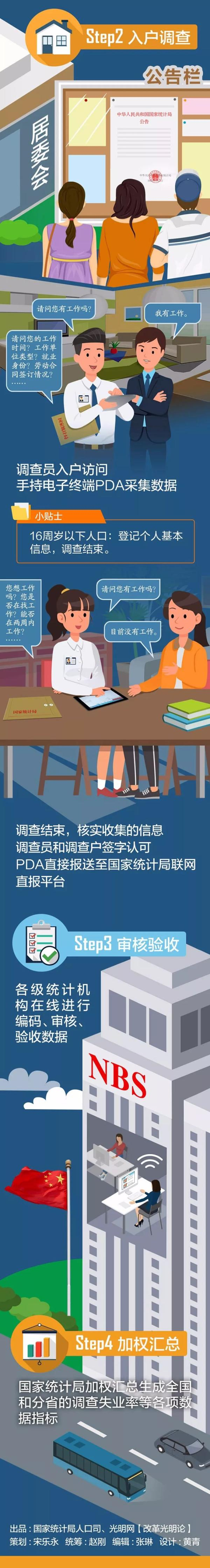 为避免样本老化,国家统计局采用样本轮换,每个调查户两年内完成4次调查后退出调查。在入户调查之后,数据直接报送至国家统计局联网直报平台,然后由各级统计机构在线进行编码、审核、验收数据。最后,国家统计局加权汇总生成全国和分省的调查失业率等各项数据指标。