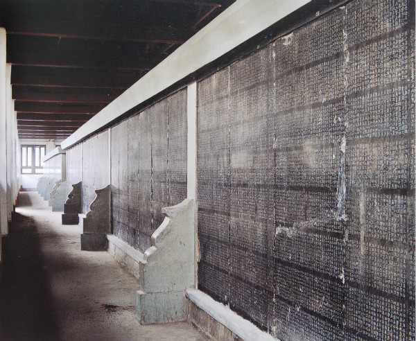 《开成石经》始刻于文宗大和七年十二月(834年),开成二年(837)完成。依次计有《周易》《尚书》《诗经》《周礼》《仪礼》《礼记》《春秋左传》《春秋公羊传》《春秋谷梁传》《孝经》《论语》《尔雅》等12种儒家经书,另有《五经文字》《九经字样》附于《春秋左传》之末。共刻114块碑石,每石两面刻,每碑上下分为8段,每段中每行刻10字,共刻经文650252字。碑石高约2.16米,面宽71-97厘米不等。下设方座,中插经碑。原碑立于唐长安城务本坊的国子监内,宋时移至府学北墉,即今西安碑林。《开成石经》是中国古代保存最早、最完好的儒家刻经,堪称中华文化的原典。