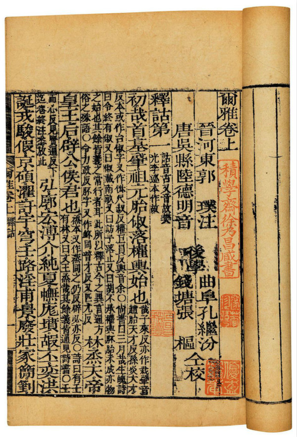 例如,《尔雅》初成于战国末年,到西汉已经全面修订成稿。由于它汇总、解释了先秦古籍中的许多古词古义,因而成为古代文人儒生们读经、通经的重要工具书。汉文帝曾置《尔雅》传记博士,实际上是将《尔雅》同《论语》《孝经》《孟子》一样看做“准经”。西汉末年,刘歆创立古文经学,古文经学的着力点在名物训诂,因而十分赞赏古代名物训诂的开山之作《尔雅》。在其撰述的《七略》中就将《尔雅》附于《孝经》之后。