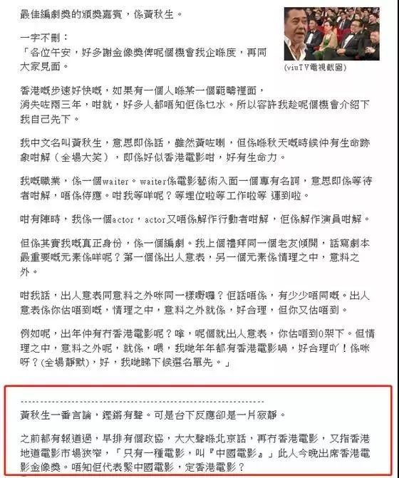 那么,黄秋生在致辞时到底说了什么?