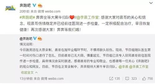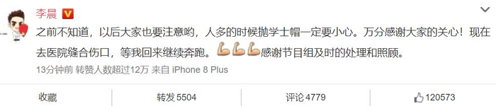 但是节目中出现了一个小意外,有媒体报道称节目录制中李晨不小心被学士帽砸伤,疑似额头出血。随后,《奔跑吧》节目组发文确认了李晨受伤的消息,表示节目组随队医生第一时间对伤口进行了包扎,目前李晨已无大碍。