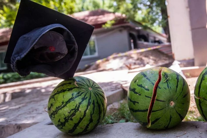 第一次试验以失败告终,学士帽并没有切开西瓜: