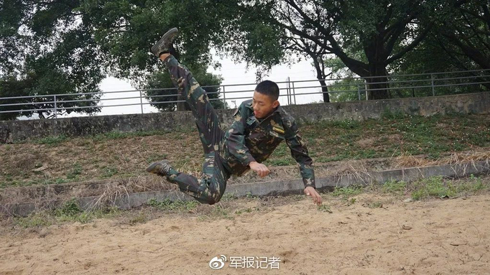 “接下来我给大家做个示范。”班长程朋整理好着装,揉一揉前期因为课目示范而擦伤的手心,顺势给大家来了一动。