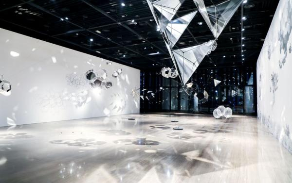 进入二楼展厅,观众可以看到艺术家以从云朵、泡沫和神经网络获得的灵感,并通过不同形状和几何的“飞行雕塑”和互动装置为观者营造出体验式的奇妙景象。