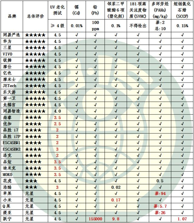 苹果手机壳多环芳烃含量为94mk/kg,超出标准单项限值近50倍。