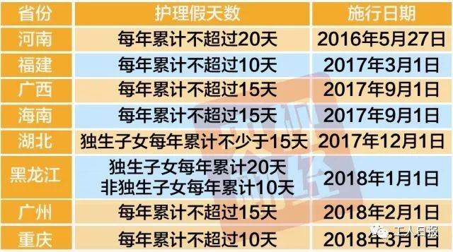 今年1月,全国老龄办向媒体发布消息称,到2017年底,已有8个省份通过地方立法建立了独生子女家庭老年人护理假制度。
