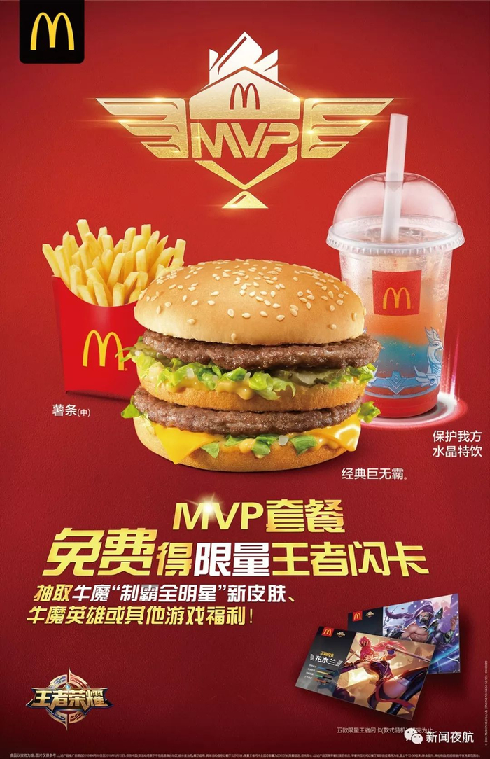 新秀巨无霸、经典巨无霸、大将巨无霸,那么大鸡小块,那么大圆筒,红蓝霸霸力量条,保护我方水晶特饮,团战鸡盒,王者荣耀小食盒产品以实物为准,图片仅供参考。上述产品推广日期自2018年4月18日至5月17日,仅在中国(本活动场景下不包括港澳台地区)部分麦当劳®餐厅适用,具体活动信息以餐厅公示为准。那么大鸡排1份是指切成4小块的一整块鸡排。4月18日-5月15日,玩王者荣耀游戏(排位赛或匹配赛),获胜或获MVP(胜方),即可获得麦当劳优惠券,全国所有价格组餐厅参与兑换。其中获胜者可获10元保护我方水晶特饮优惠券1张(线上领券,线下核销并支付10元),获MVP者(仅胜方)可获20元巨无霸中套餐优惠券1张(线上领券,线下核销并支付20元)购买MVP套餐1份,可免费得限量王者闪卡1张,全国限量为200万张,款式随机,限量赠送,送完为止,具体以餐厅公示为准。闪卡兑换页面规则请详见兑换页面,兑完为止。本活动适用于餐厅柜台点餐、麦当劳APP、微信小程序、自助点餐服务,不适用于甜品站、McCafé柜台、麦乐送®送餐服务。上述产品仅限早餐时段后供应,早餐供应时间以餐厅实际供应情况为准,至上午10:30结束。除食品外(包括容器),其他物品不在售卖范围内。“Coco-Cola”、「可口可乐」是可口可乐公司的商标。
