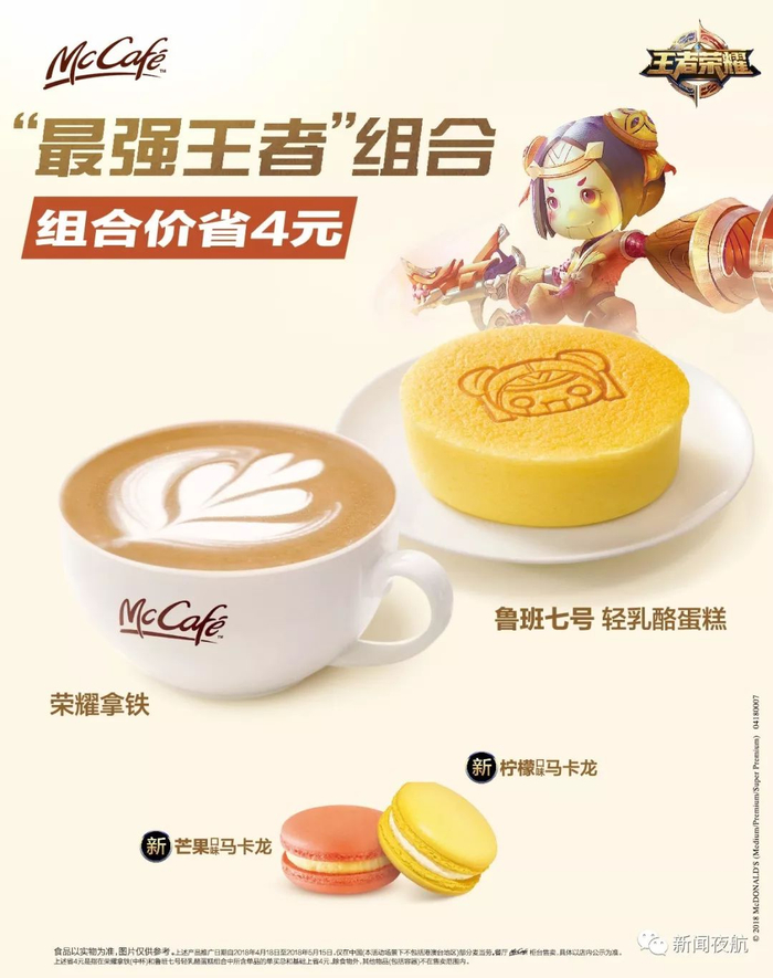 荣耀拿铁,鲁班七号轻乳酪蛋糕,芒果、柠檬口味马卡龙产品以实物为准,图片仅供参考。上述产品推广日期自2018年4月18日至5月15日,仅在中国(本活动场景下不包括港澳台地区)部分麦当劳®餐厅McCafé柜台售卖,具体活动信息以餐厅公示为准。上述立省4元是指荣耀拿铁(中杯)和鲁班七号轻乳酪蛋糕组合中所含单品的单买总和基础上省4元。除食品外,其他物品(包括容器)不在售卖范围之内。